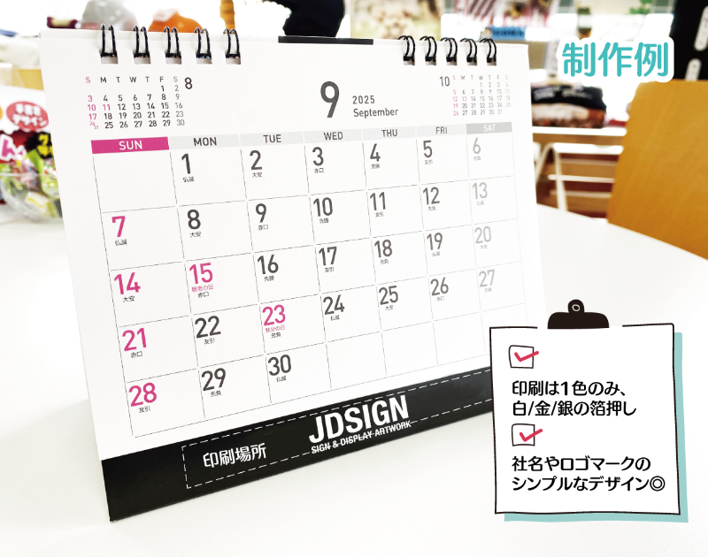 卓上カレンダー:名入れは黒い台紙に行ため、白印刷が基本。金や銀の箔押しで高級感アップ。