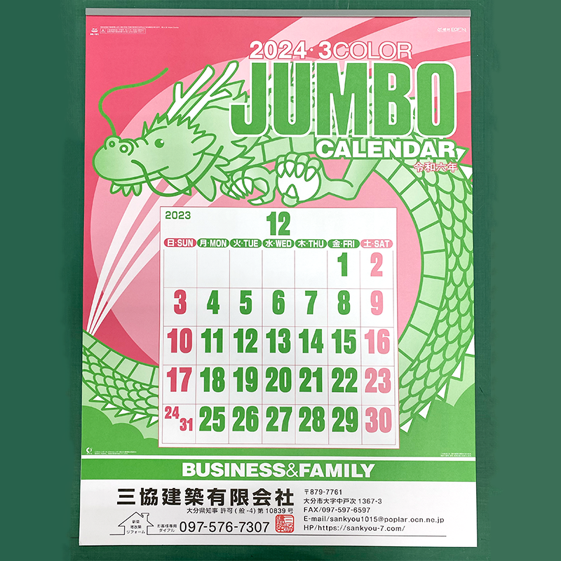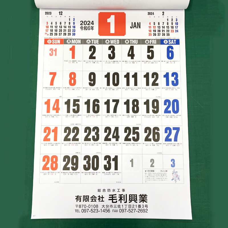 壁掛けカレンダー:フルカラー印刷が基本。単色印刷で価格を抑えることが可能。