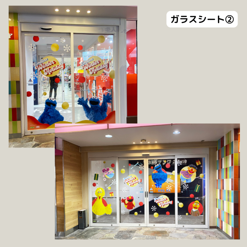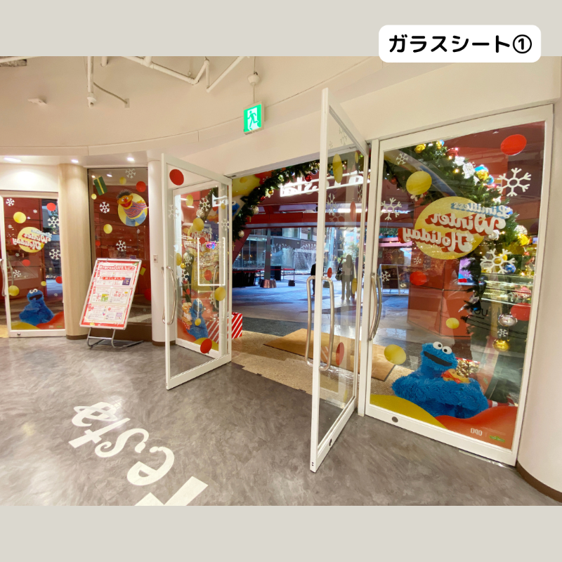 セサミストリートのキャラクターたち、雪の結晶、飾り玉をレイアウトしたガラスシートを制作しました。