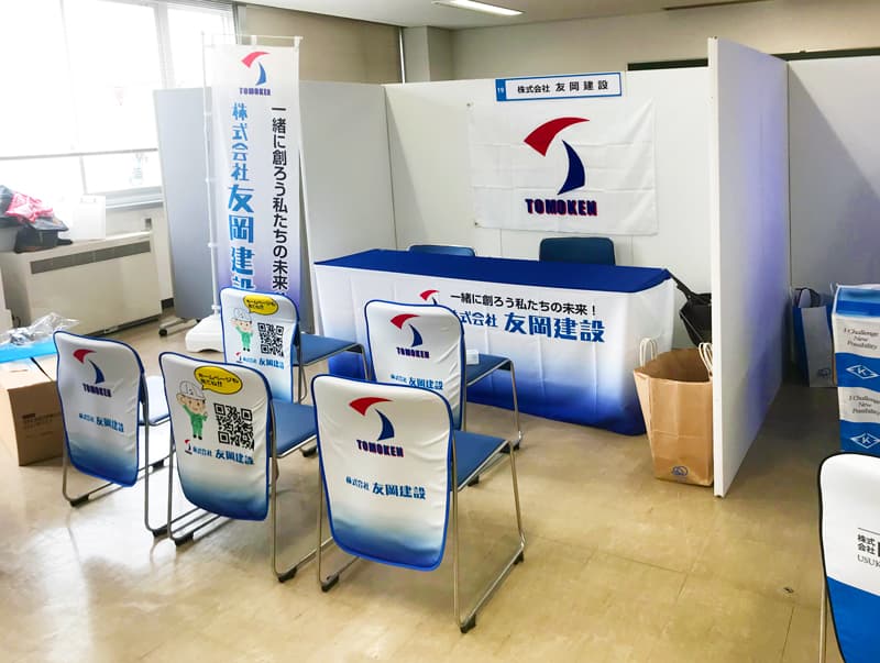 社屋前の立脚式の社員募集看板と、就活ブース装飾を