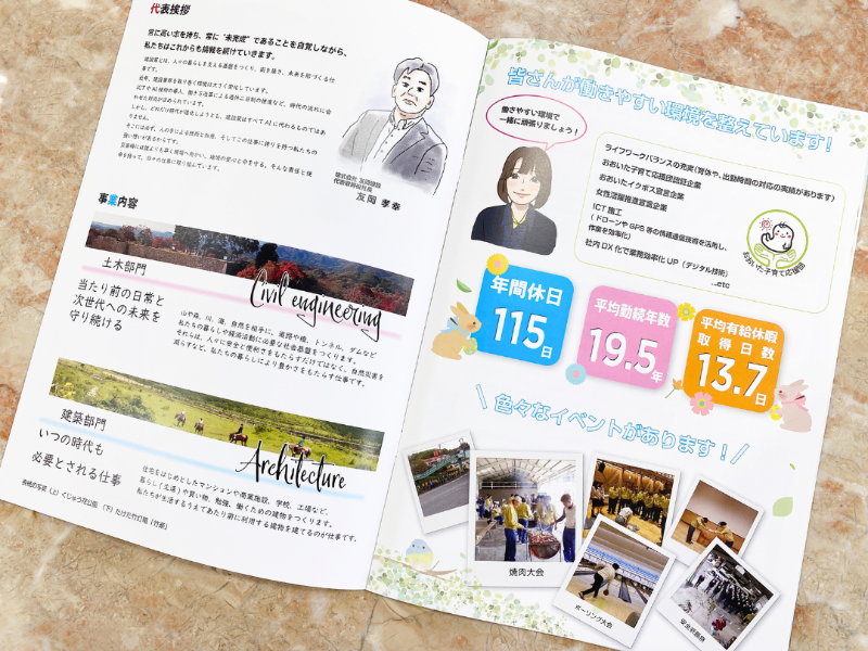 また、社長挨拶や社員インタビューのページでは、社長と代表社員の似顔絵を掲載。一般的な建設業パンフレットではあまり見られない、オリジナル性と親しみやすさを兼ね備えた仕上がりとなりました。