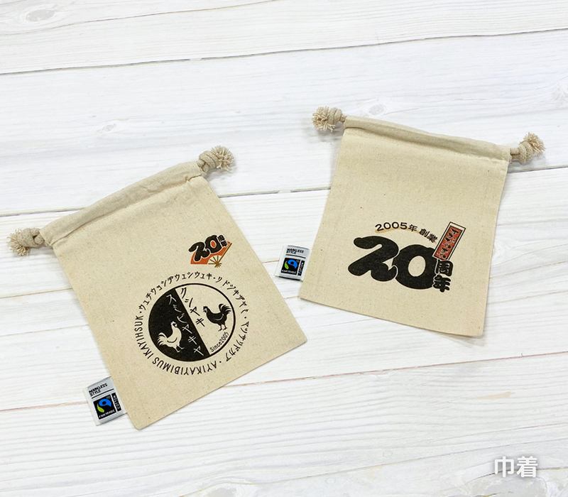 検討の結果、巾着とハンカチタオルの2種類の周年記念品を制作することに決定。巾着は小物入れとして便利で、買い物や外出でも気軽に使えるアイテム。ハンカチタオルは毎日使うことができ、老若男女問わず喜ばれる実用アイテムです。