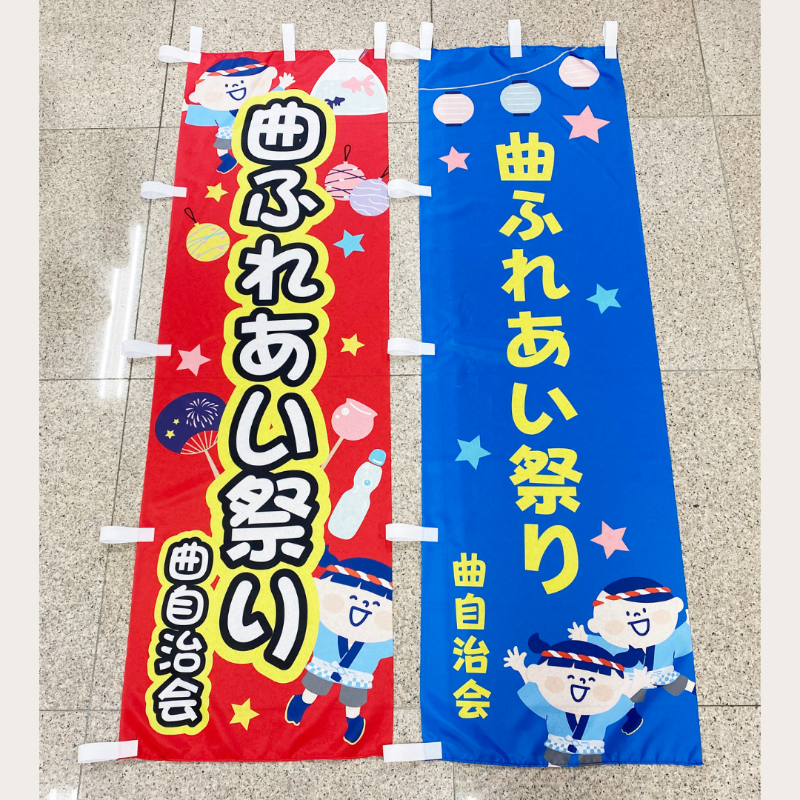 今回ご依頼いただいたのは、地域の祭りで使用する「のぼり旗」と「卓上ミニのぼり」です。ご依頼主は、地域イベントを通じて住民同士の交流を大切にされている曲自治会様。「お祭りの会場をもっと明るく、親しみのある雰囲気にしたい」という想いから、のぼり旗制作をご相談いただきました。