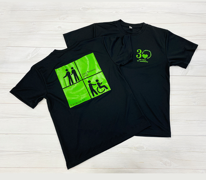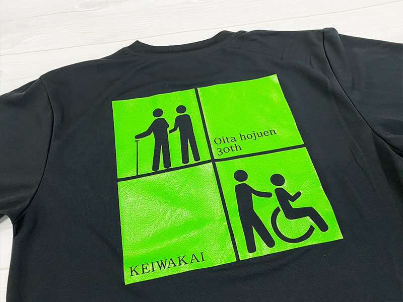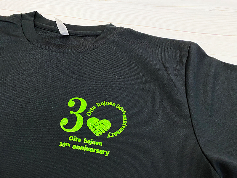 福祉施設大分豊寿苑様より、創立30周年を記念したお祝いの会を開催するのに合わせ、職員が着用するTシャツと、合わせて配布用の記念品としてボールペンを作りたいとのご依頼をいただきました。