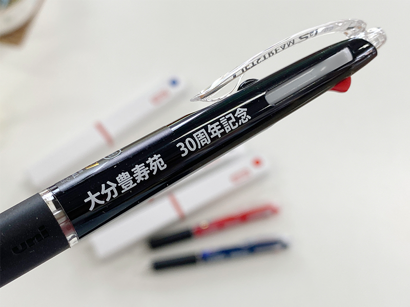 本体の色は黒、赤、青の3色で、それぞれ軸部分に白文字で「大分豊寿苑 30周年記念」と名入れ。清潔感と視認性を兼ね備えたシンプルなデザインで、どんなシーンでも使いやすい印象に仕上げました。