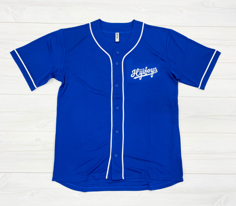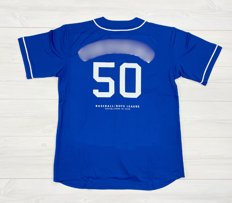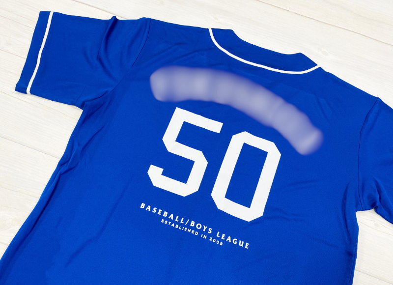 シャツ本体はチームカラーであるブルー。デザインは白の印刷で左胸にはチームロゴを配置し、背中には番号とお名前を大きくプリントしました。市販のベースボールシャツをベースにしながらも、印刷を加えることで世界にひとつだけのオリジナルユニフォームが完成しました。
