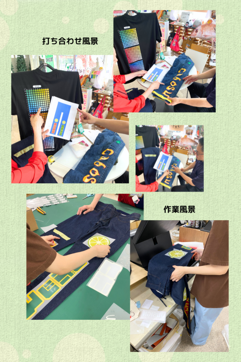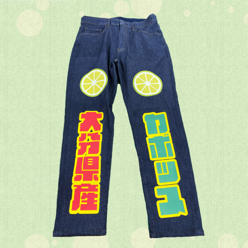 最終的に完成したジーンズは、遊び心と地元愛が融合したオリジナルデザインです。膝の位置にはカボスを半分に切ったイラストを配置。右脚には「大分県産」という力強い文字をあしらい、左脚には決めセリフ「カボッス」をデザイン。カボスひろし様のキャラクター性を大切にしつつ、大分県をアピールする唯一無二のジーンズが完成しました。