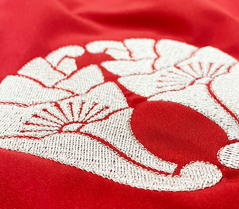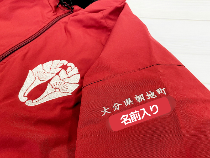左胸には、家紋の「抱き花杏葉」を刺繍で表現。印刷とは異なり、糸の立体感が際立つ刺繍仕様は、高級感と伝統美を兼ね備えたポイントです。さらに左袖には、各メンバーのお名前を個別に刺繍。チーム全体の統一感を保ちながら、個人の特別感も演出できる仕様となっています。